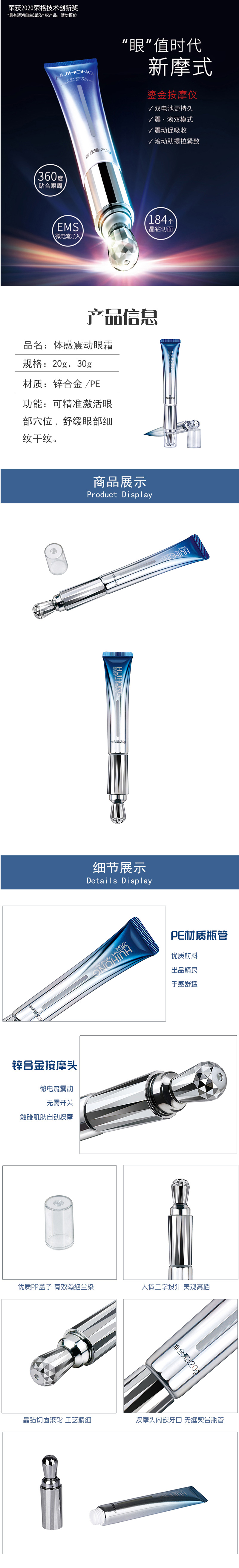 工艺设计特点: 104个晶钻切面滚轮按摩/颜色可定制/软管真空瓶可定制